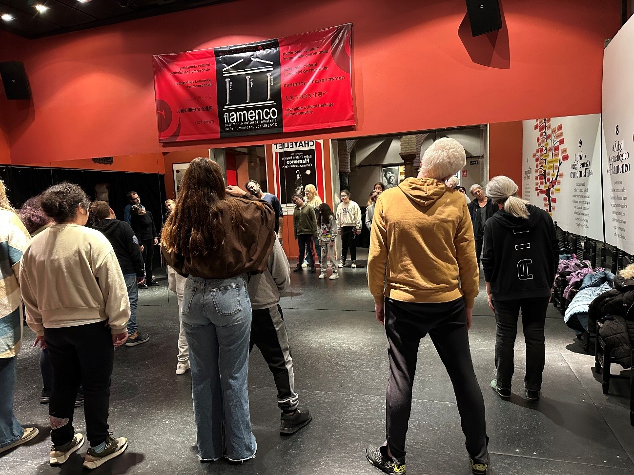 UN GRUPO DE ALUMNOS REALIZANDO EJERCICIOS DE CALENTAMIENTO ANTES DE LA CLASE DE BAILE.