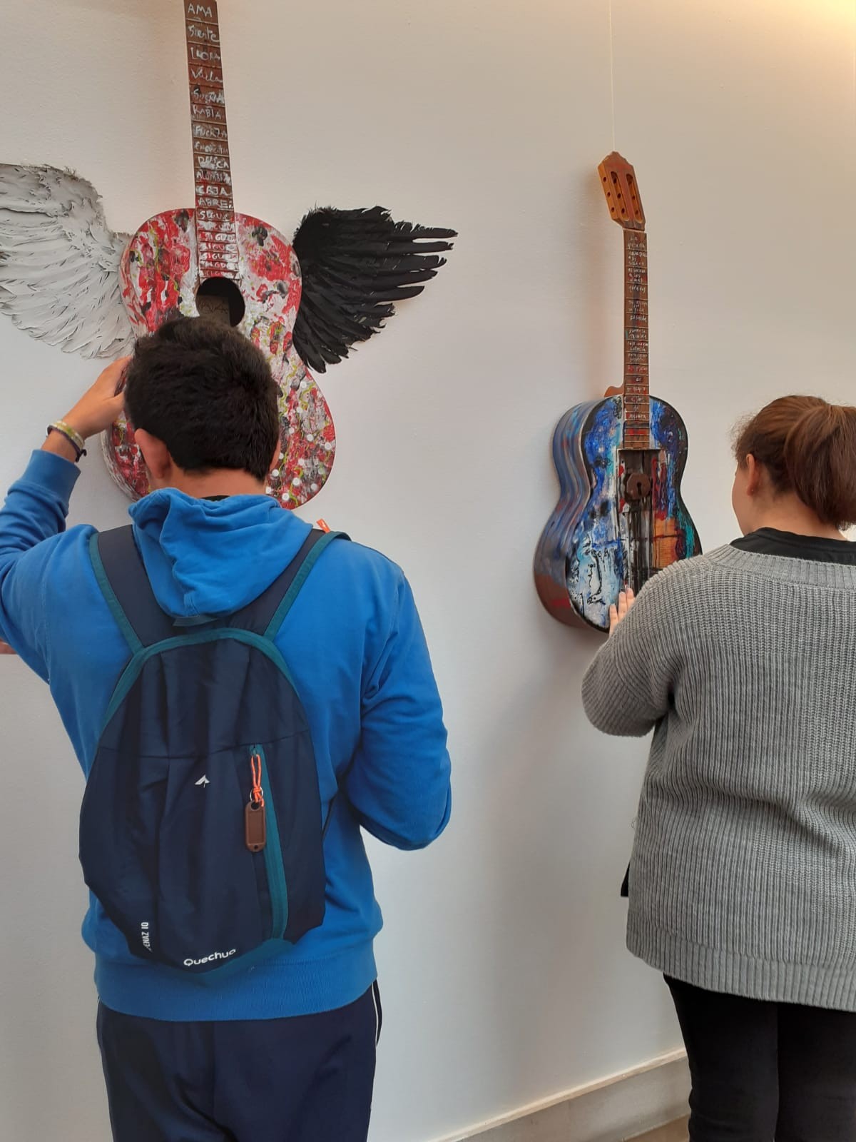 DOS ALUMNOS EXPLORAN DOS GUITARRAS DECORADAS DEL MUSEO.