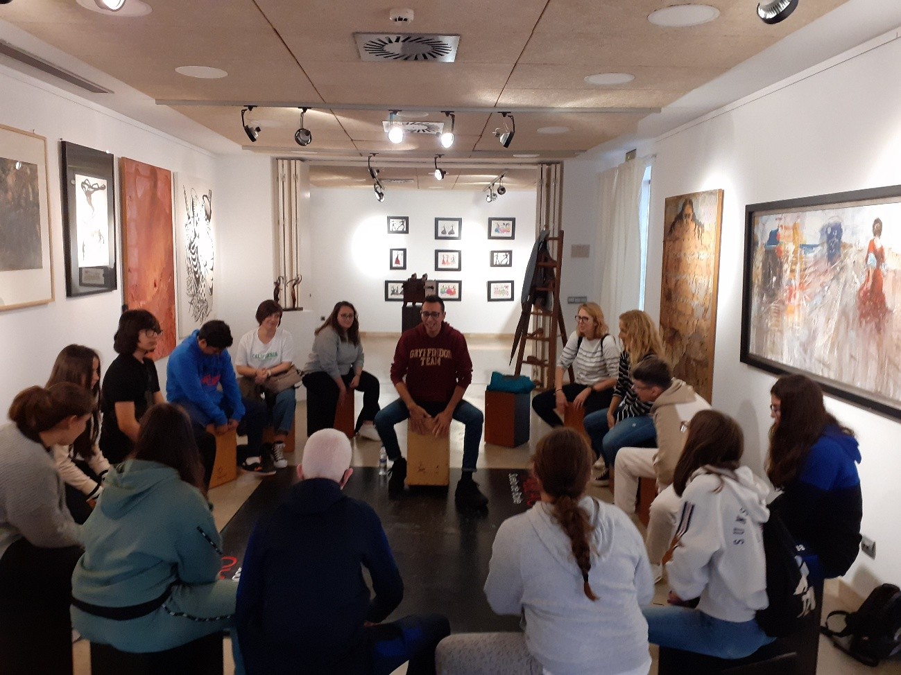 ALUMNOS EN CIRCULO RECIBIENDO SU CLASE DE PERCUSIÓN CON EL CAJÓN FLAMENCO.