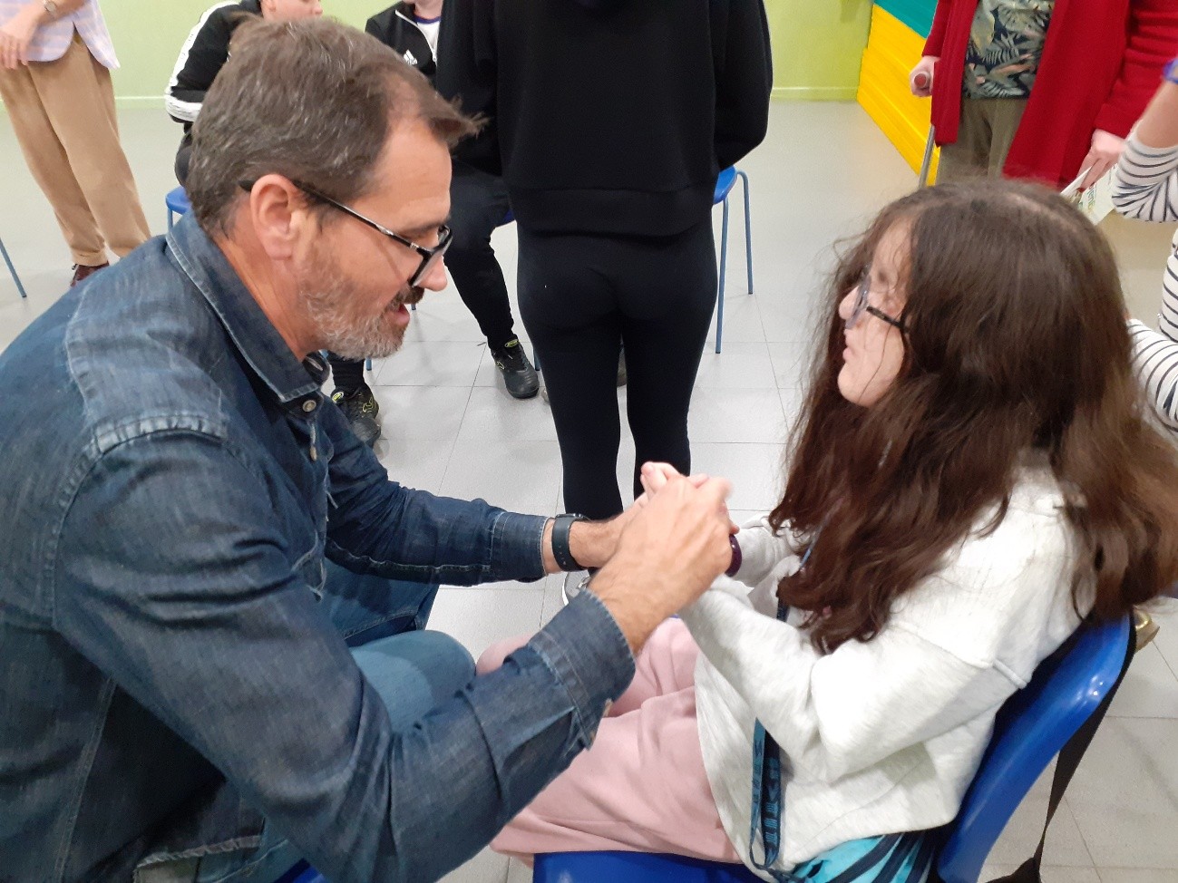 UN MONITOR AYUDANDO A UNA ALUMNA TOMANDO SUS MANOS PARA APRENDER A HACER SU SIGNO.