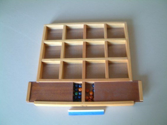 - CAJA DE MADERA CON 12 DEPARTAMENTOS PARA REPRESENTACIONES NUMÉRICAS Y DOS DEPÓSITOS PARA CUENTAS. INDICADO PARA EL APRENDIZAJE MANIPULATIVO DEL CONCEPTO NUMÉRICO, DE OPERACIONES ELEMENTALES Y DE CAMBIOS DE BASE.