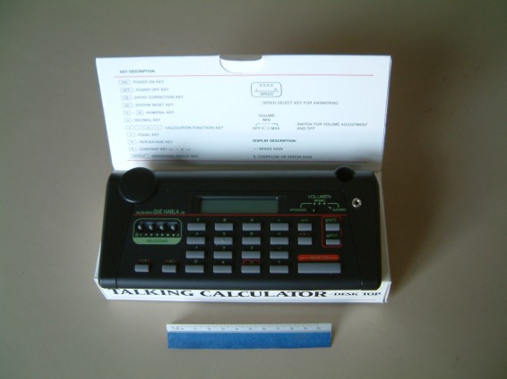 - CALCULADORA PARLANTE EN CASTELLANO, A PILA, CON REGULADOR DE VELOCIDAD, POSIBILIDAD DE REPETICIÓN Y VOLUMEN REGULABLE O POSICIÓN MUDA. TIENE AURICULAR